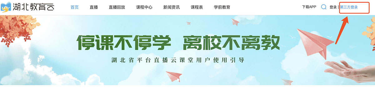 用户可以输入网址www.hbeducloud.com,默认进入省平台首页,点击右上角第三方登陆